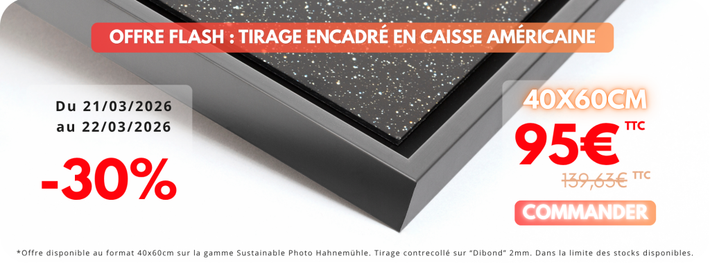 À partir du format 20x30cm sur papier Hahnemühle brillant ou satiné, 260gr. Possibilité de contrecoller et d’encadrer vos images.
